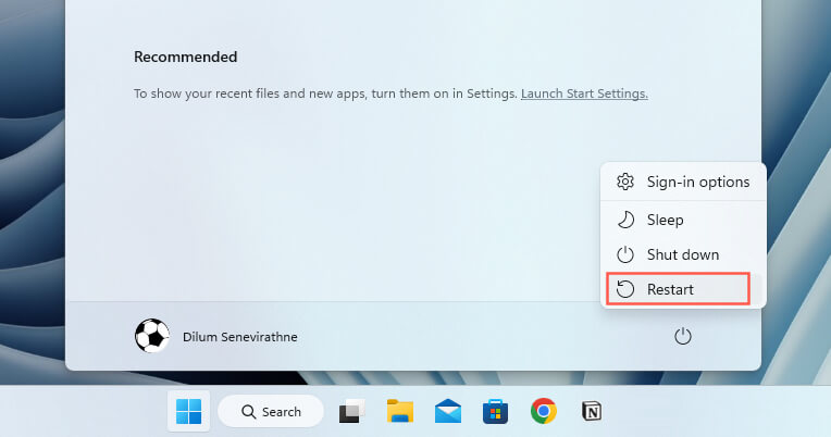 If you’ve previously had no trouble connecting your iPhone to your PC, then it’s likely you’re dealing with a minor system-related glitch preventing the devices from communicating. The quickest way to resolve that is to restart Windows 11. To do that: