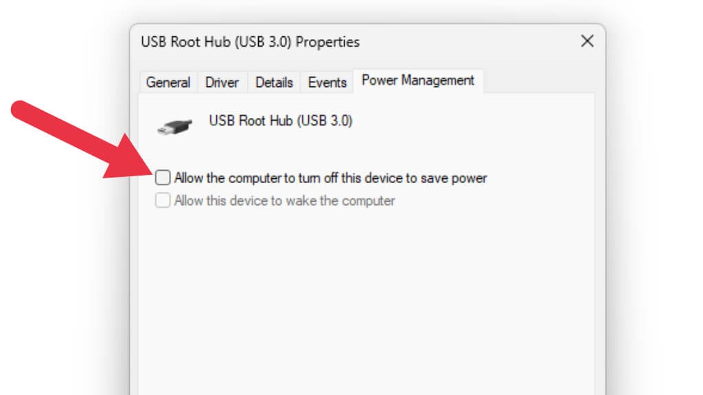- Under the Power Management tab,uncheck ” Allow this computer to turn off this device, ” then select OK to save your changes.