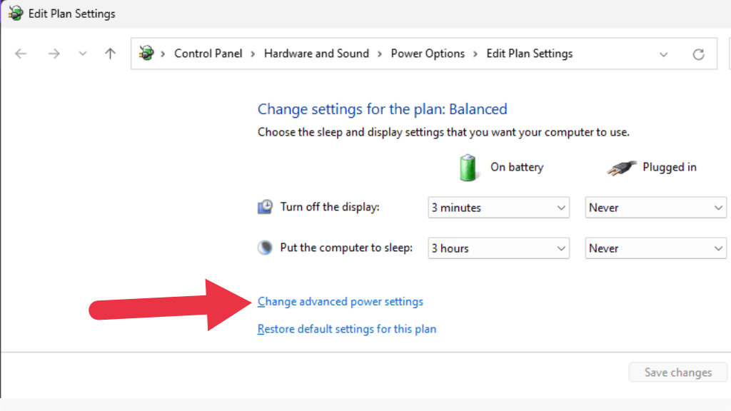 - In the Edit Plan Settings Window, select Change advanced power settings.