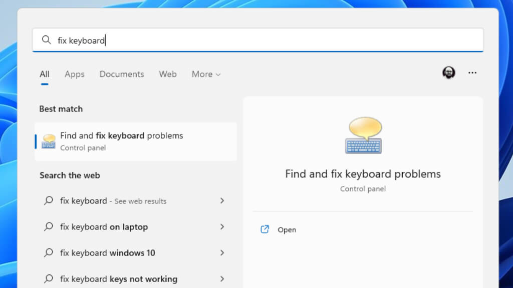 Open the Start Menu and search for “fix keyboard” then select Find and fix keyboard problems. You can also find this troubleshooter by searching in the Control Panel.