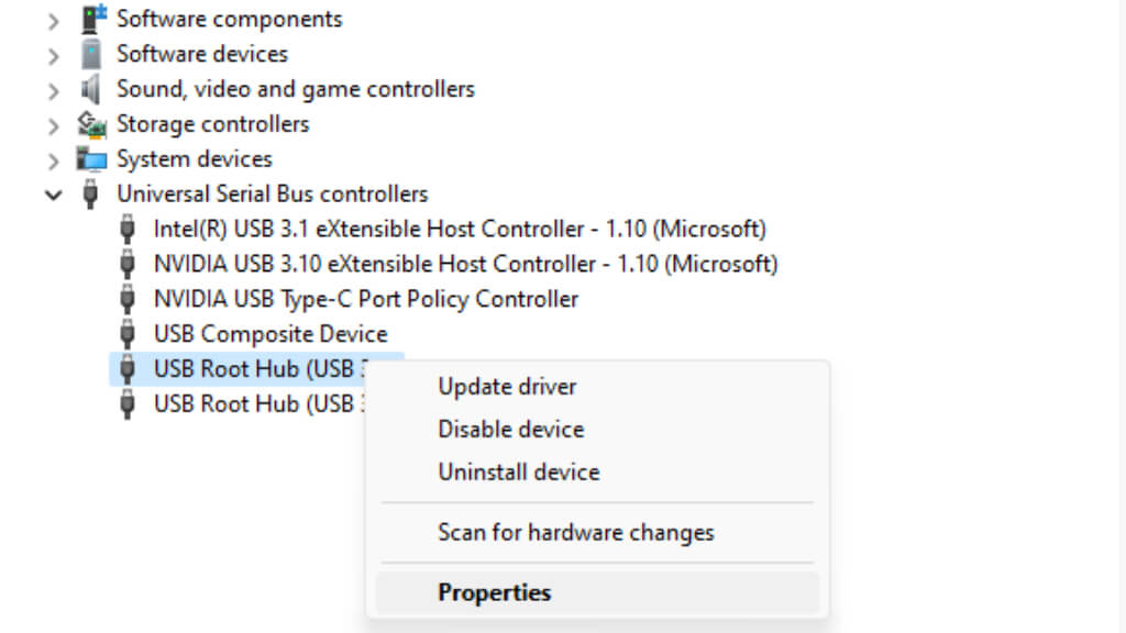 - Expand the Universal Serial Bus Controllers section, then right-click on the Root Hub or Generic Hub and select properties.