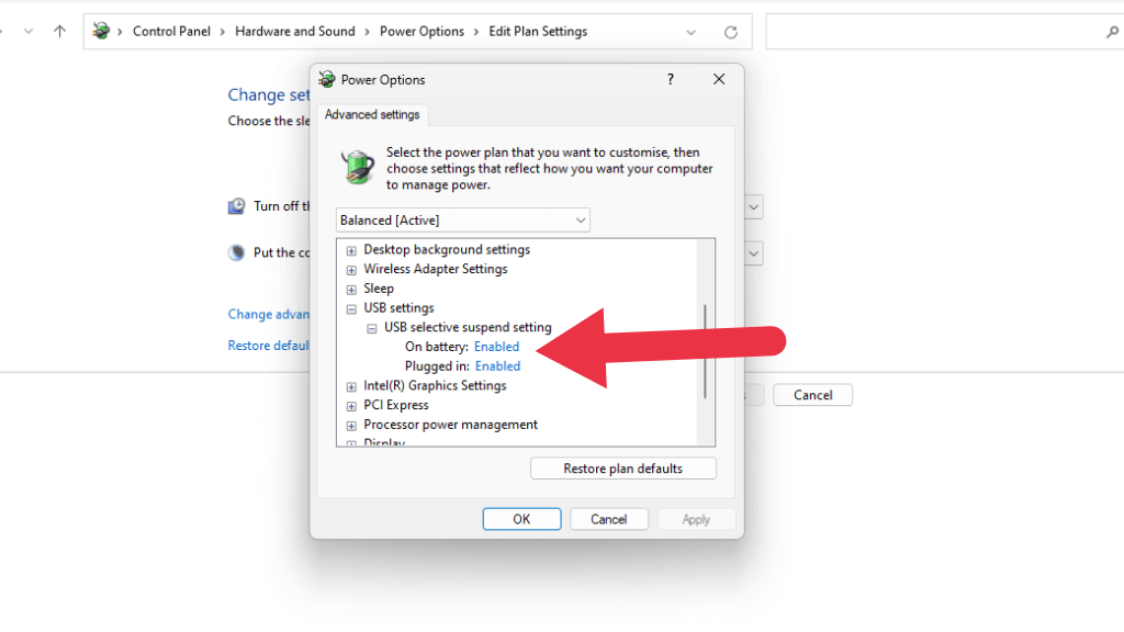 - In the Power Options window, look for USB settings > USB selective suspend setting, and then choose to enable or disable the function on battery, AC power, or both.