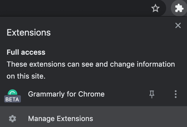 To disable the extensions in Google Chrome, open the** Extensions menu** in the upper-right corner of the screen and select Manage Extensions.