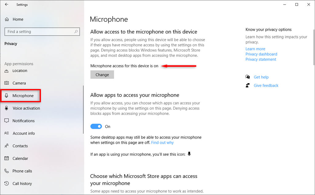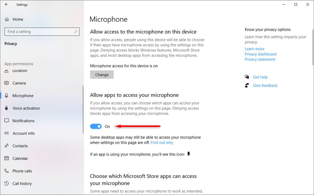 - If it is, toggle the option off and back on again under “Allow apps to access your microphone.”