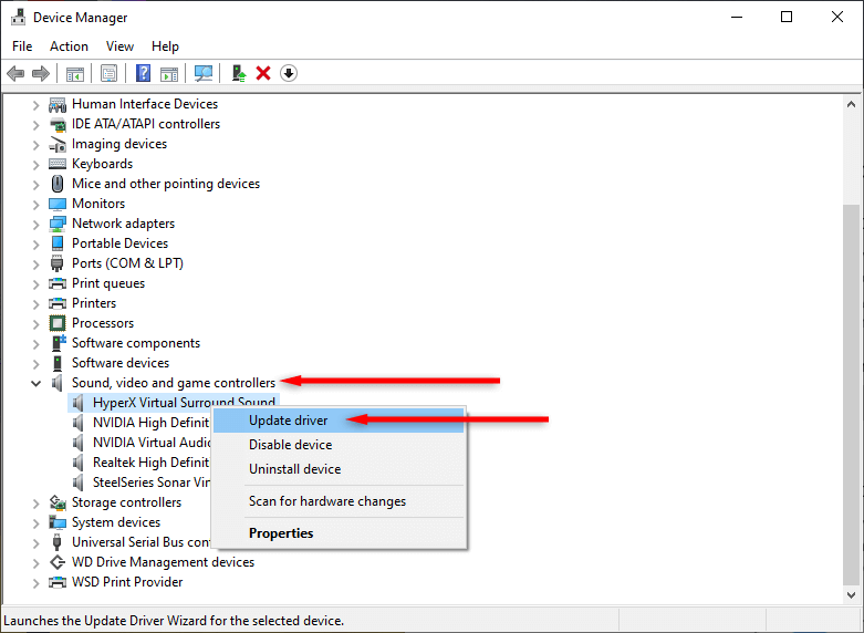 - Double-click Sound, video, and game controllers. If the device isn’t listed here, it might be under Imaging devices or Cameras. * In the drop-down menu, right-click your peripheral and select Update driver.