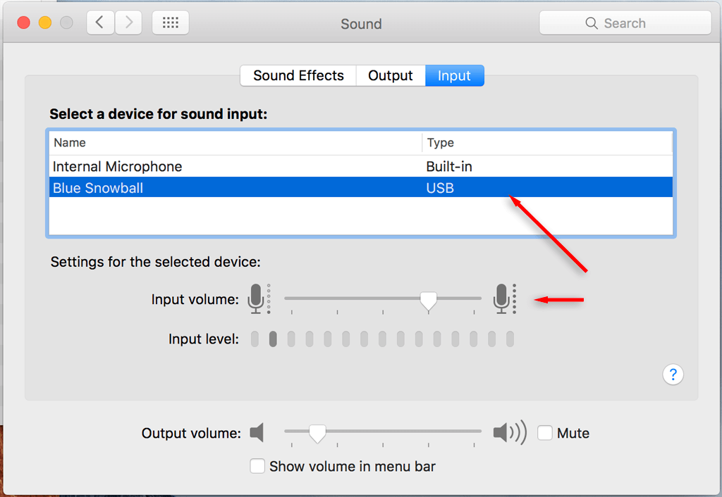 - Select Input. * Make sure the correct device is selected and ensure that the Input volume is sufficiently high.