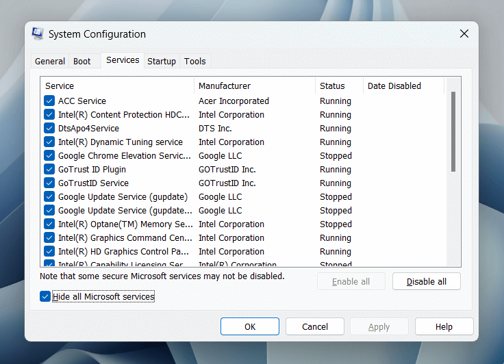 - Check the box next to Hide all Microsoft processes and choose Disable all.