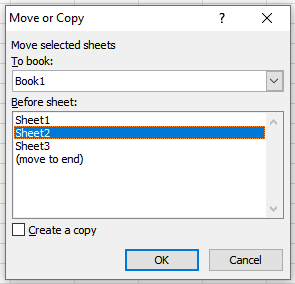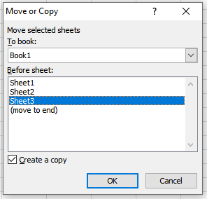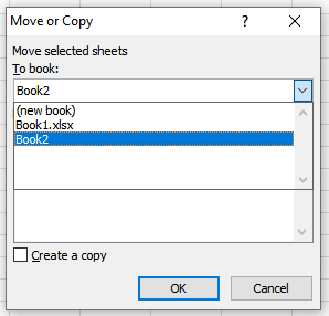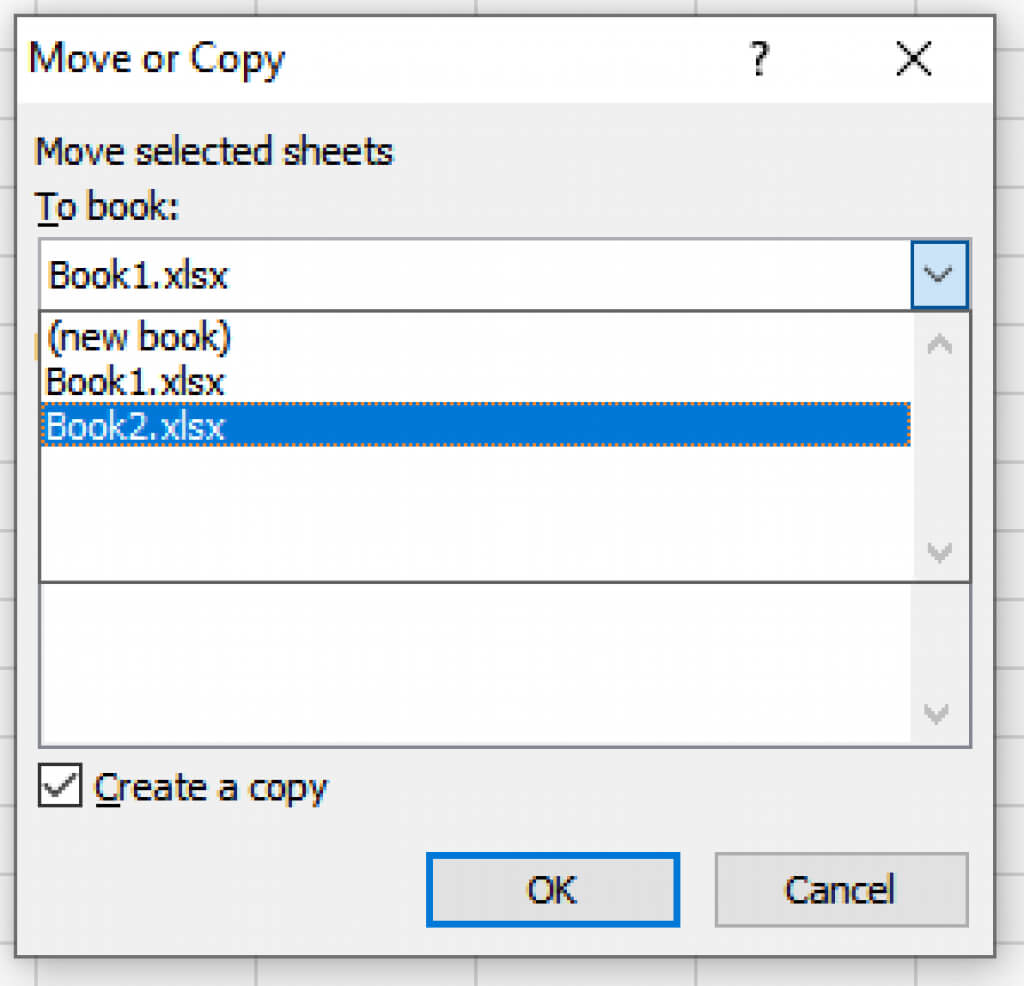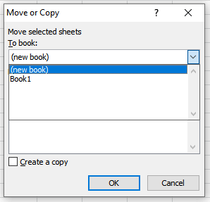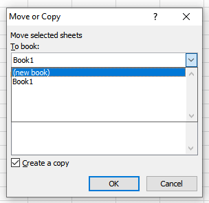 If you want to copy a worksheet in a new workbook you will again have to go to Move or Copy in the context menu and check the Create a copy box. Under “To Book” click the drop-down menu and select (new book). Excel will create a new workbook containing the copied worksheet.