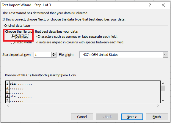 - Select the CSV file you want to open in Excel and click Import. In a new window that pops open click Delimited and then Next.