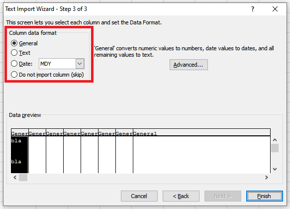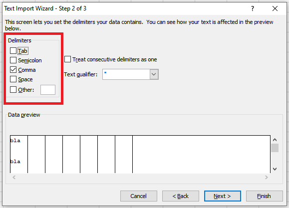 - In a new window, under Delimiters, check the Comma box and then Next.