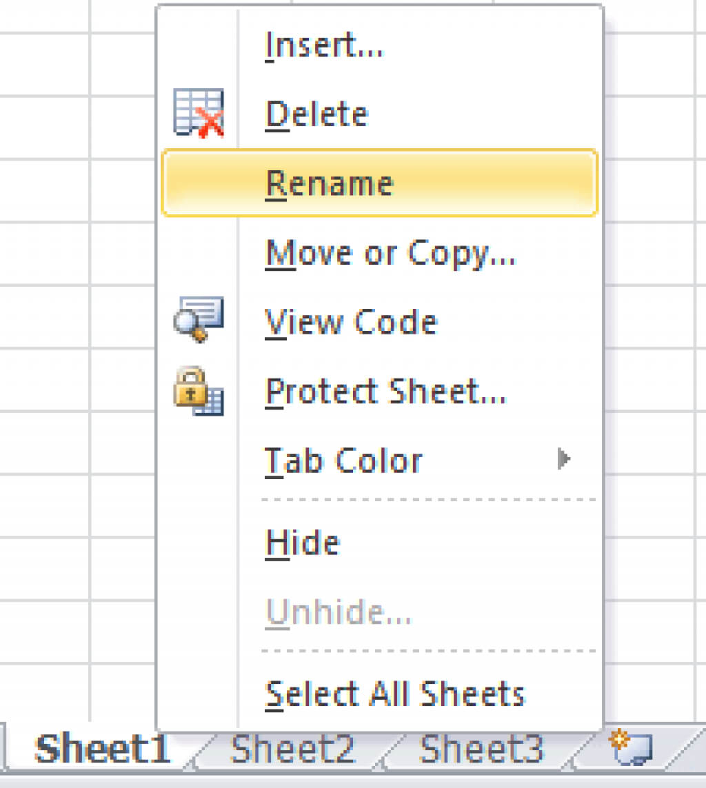 Renaming a worksheet is easy. Just right-click on the tab and a context menu will open. Choose Rename and type in the new name. You can also double-click the tab you want to rename and type the new name.