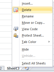 Deleting worksheets is simple. Right-click on the tab of the worksheet. A context menu will appear and simply click Delete.