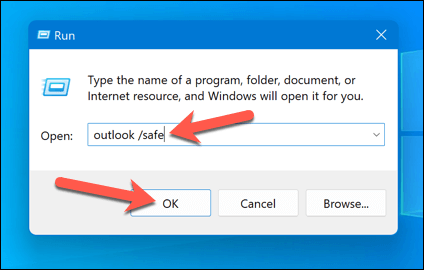 - In the Run box, type outlook /safe and press OK.