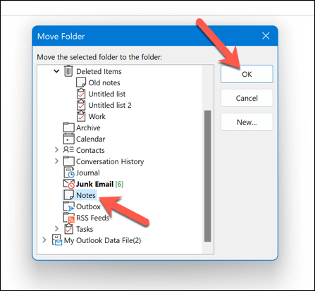 - Choose the Notes folder and press OK to confirm.