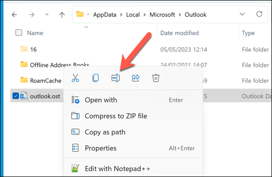 - Right-click the file and select Rename, then rename your current data file to an alternative (eg. if the file is named outlook.ost, rename it to outlook-original.ost).