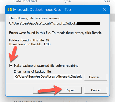 - The repair tool will check your file for errors. If it detects any, it will ask you if you want to save a backup before you repair it. Make sure that the Make backup of scanned file before repairing checkbox is enabled before you press Repair.