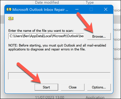 - In the Microsoft Outlook Inbox Repair Tool window, press Browse and locate your .pst or .ost file—it’s typically found in the C:\Users\\AppData\Local\Microsoft\Outlook folder. Replace with the name of your user folder. If you’re unsure, you’ll need to search your PC for files with the .pst file extension first. * Once located, press Start to begin the repair process.