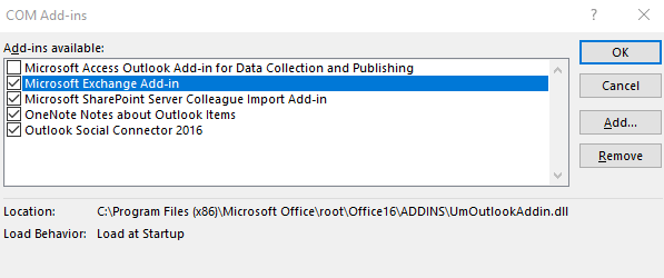 - If the **COM Add-ins** listing opens, take a screenshot of the property sheet and save the image or record each selected add-in listed under **Available Add-ins**. Once this is done, clear all the selected check boxes and then select **OK**.