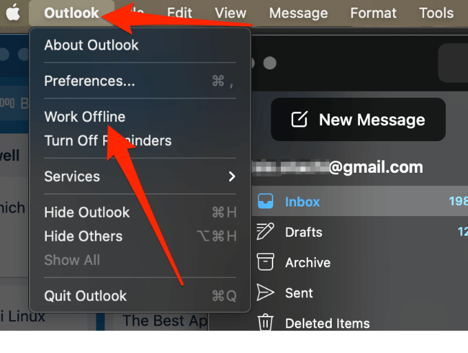For Mac, select Outlook on the menu bar and then select Work Offline.