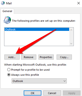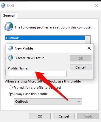 - Select **Finish** and you’ll find your new profile’s name added in the **Mail** dialog box under the **General** tab. * Next, select **Prompt** for a profile to be used under **When starting Microsoft Outlook, use this profile** and then select **OK**. * Restart Outlook and select the **new profile name** you created in the drop-down list in the **Choose Profile** dialog box. Select **OK** and check if Outlook starts normally with the new profile name.