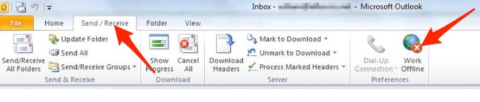 To enable Work Offline on your Windows PC, select Send/Receive > Work Offline.