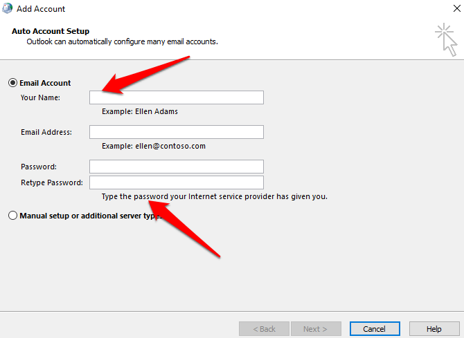 - In the Add Account Wizard, fill in Your **Name**, **Email address** and **Password** under **Email Account** on the **Auto Account Setup** page.