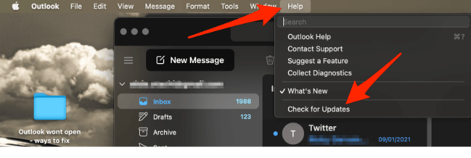 - To update Outlook on your Mac, select **Help** from the menu bar, and then select **Check****for updates**.