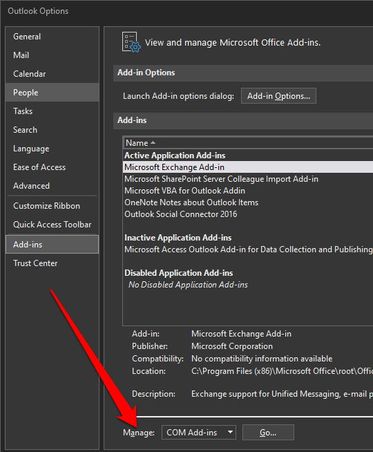 - Check whether the Manage box at the bottom of the View and Manage Office Add-ins shows COM Add-ins.
