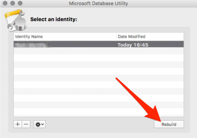 - Quit all Microsoft Office apps including Outlook and quit Messenger for Mac. * Close Outlook, hold down **Option** key and select the **Outlook** icon in the Dock to open the **Microsoft Database Utility**. * Select the identity of the database you want to rebuild and then select **Rebuild**.