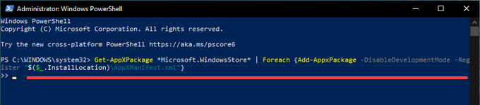 Get-AppXPackage Microsoft.WindowsStore | Foreach {Add-AppxPackage -DisableDevelopmentMode -Register “$($_.InstallLocation)AppXManifest.xml”}