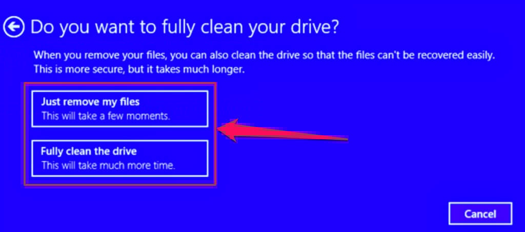 - Choose a reset option on the next page. Microsoft recommends Fully clean the drive when resetting your Surface to sell or recycle. Otherwise, select Just remove my files if you’re troubleshooting an issue.