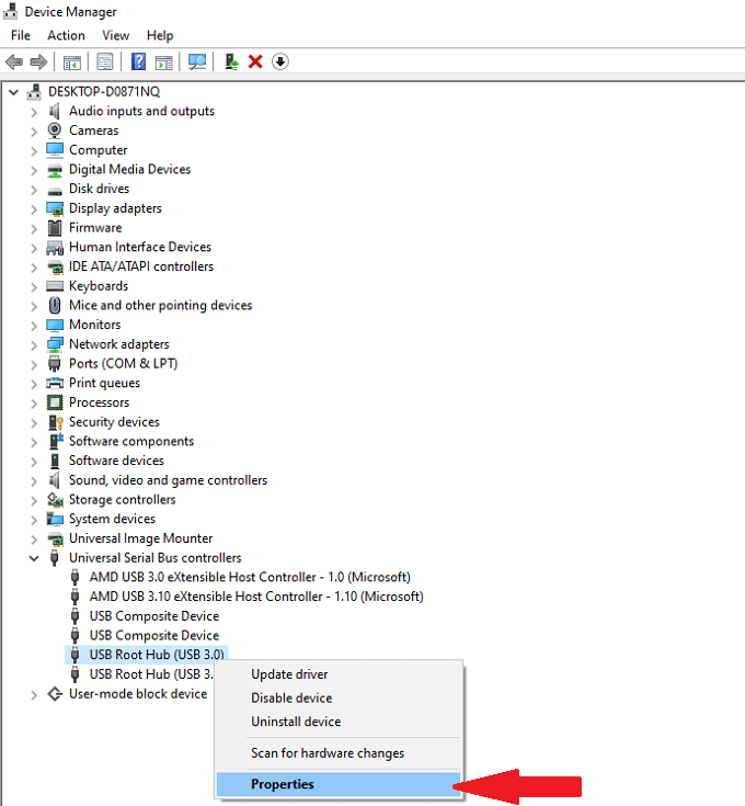 - Right-click USB Root Hub and select Properties.