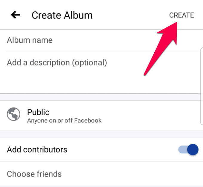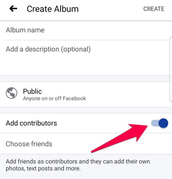 - If you want others to contribute to your album, toggle the Contributors switch and pick the names from your Friends list. Tap Done.