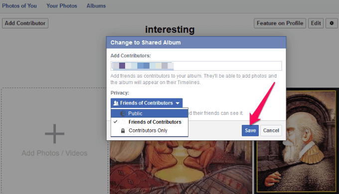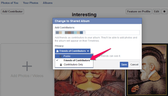 - Type the names of the contributors you want added to the album, and then choose an audience. The audience can be Album contributors only, Friends of Album contributors, or Public.