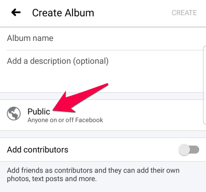 - If you want your album to have restricted access or available to the public, tap to choose privacy settings, and then tap Create.