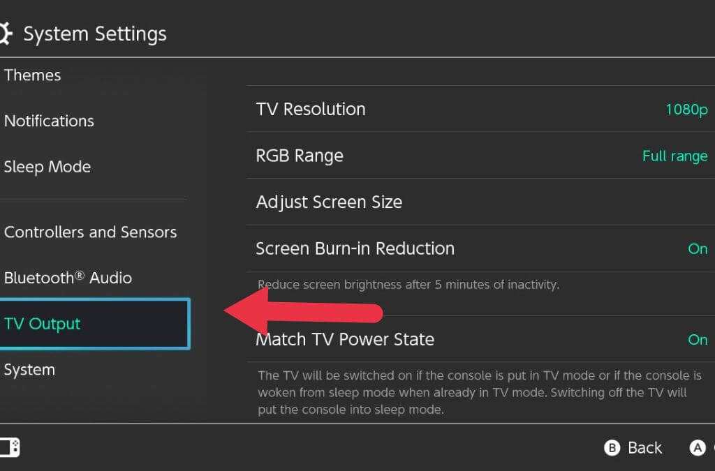 - Choose TV Output from the left-hand list.