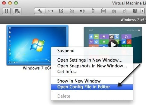 There are also some configuration settings in your VMX file related to sound that could be causing the problem. You can open the VMX file for your VM by going to the** Virtual Machine Library **and then holding down the Option key and right-clicking on the VM. You’ll see an option to Open Config File in Editor.