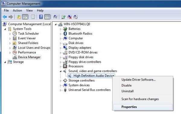 The last thing you can try is to update the audio driver from within the Windows virtual machine. To do this, you can right-click on **My Computer **and choose Manage. Then click on **Device Manager **on the left hand pane. Scroll down to Sound, video and game controllers and right-click on Creative AudioPCI (ES1371, ES1373) (WDM) if you’re running Windows XP or right-click on High Definition Audio Device.