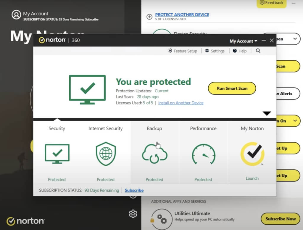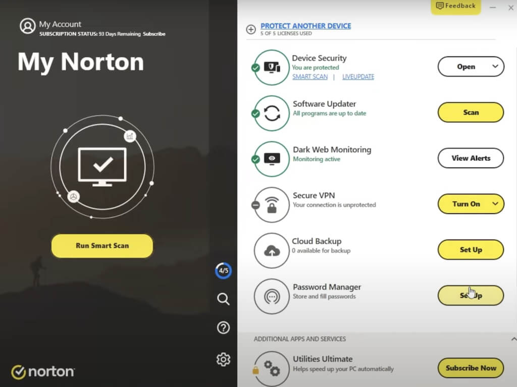On the other hand, Norton 360 showcases an intuitive dashboard with a distinct color scheme of black, white, and yellow. Its graphical user interface (GUI) is designed for both beginners and advanced users, offering a variety of features while maintaining simplicity.