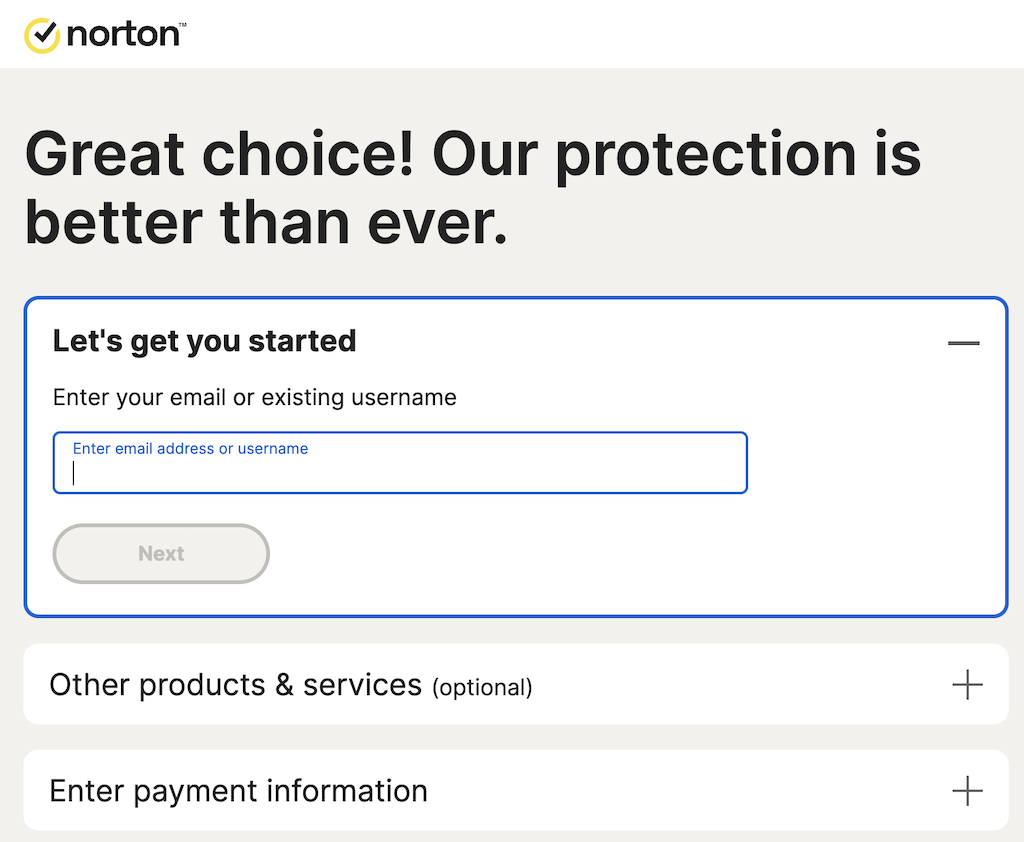 Norton provides a simple sign-up process requiring an email address and password setup, with options for convenient payment methods like Visa and PayPal.