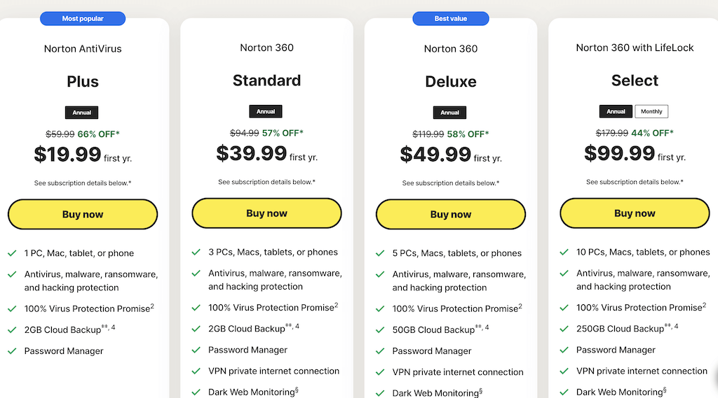 Norton security offers four consumer subscription tiers with varying features. The Antivirus Plus plan, usually priced at $59.99, which drops to $19.99 for the first year with an annual plan. It covers essentials like 2 GB cloud storage, malware protection, and a password manager.
