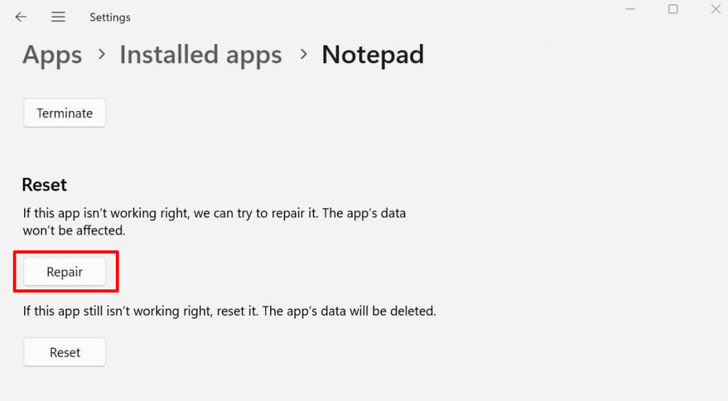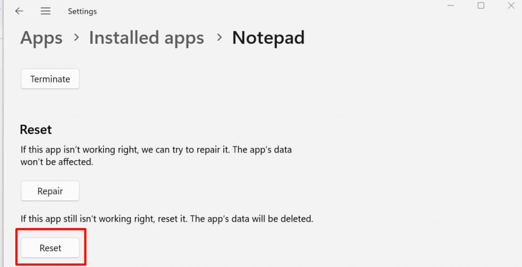 If repairing Notepad doesn’t help you, and the app continues to close automatically, try resetting it to the default settings. This will eliminate any possible corrupted files or faulty data that cause the app to crash in the first place.