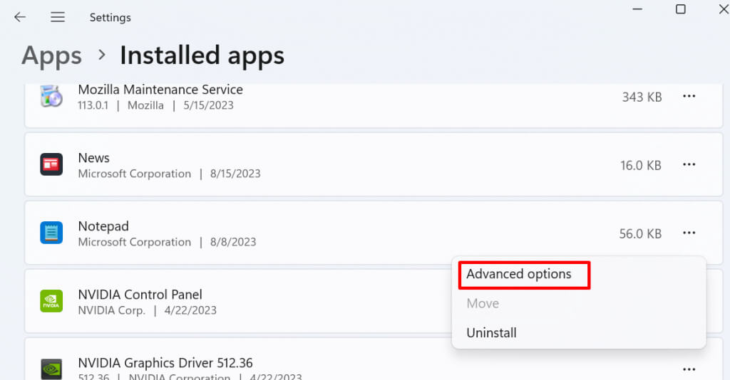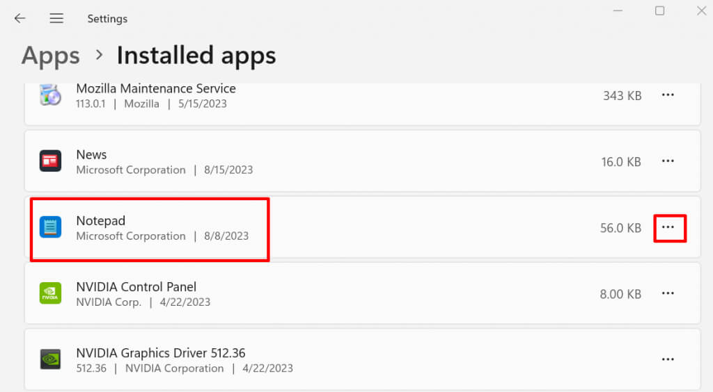 - Scroll until you find Notepad in the list of apps, and click the three dots next to it.