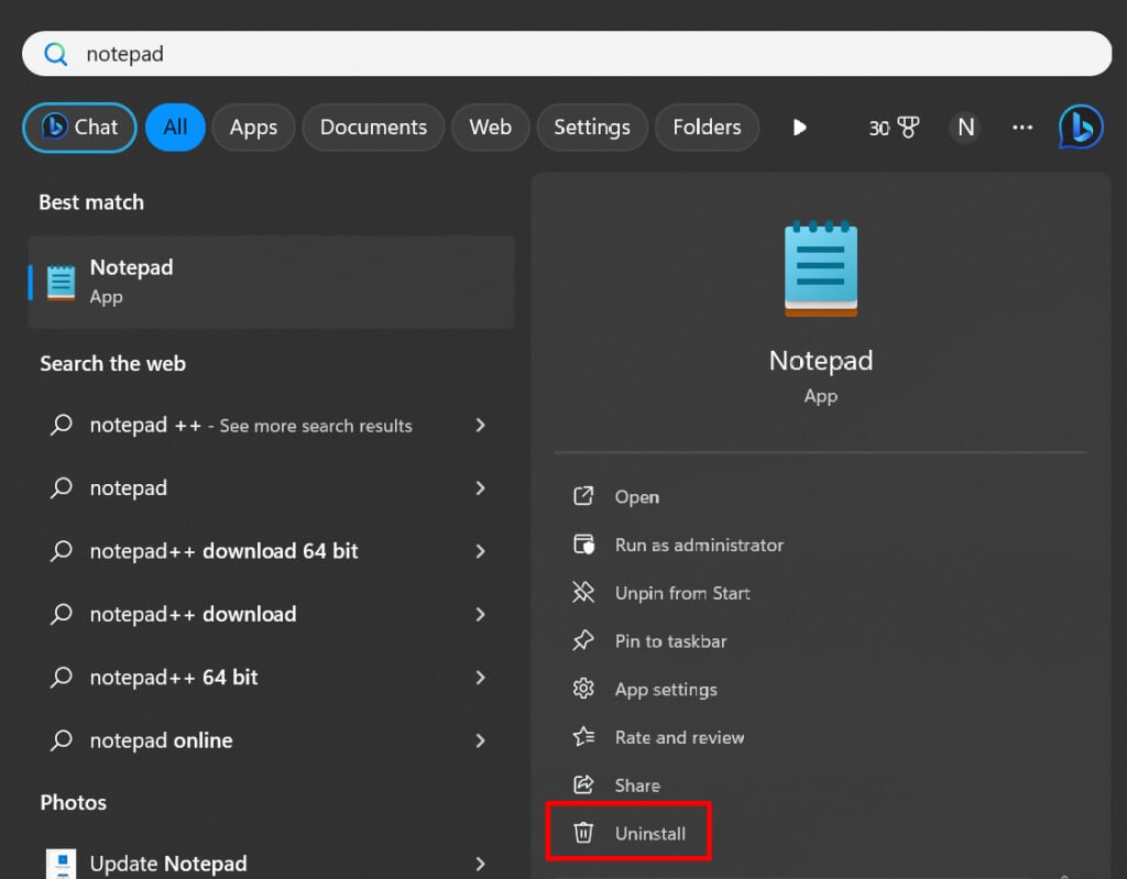 - Type Notepad in the Windows search bar, and select the Uninstall option.