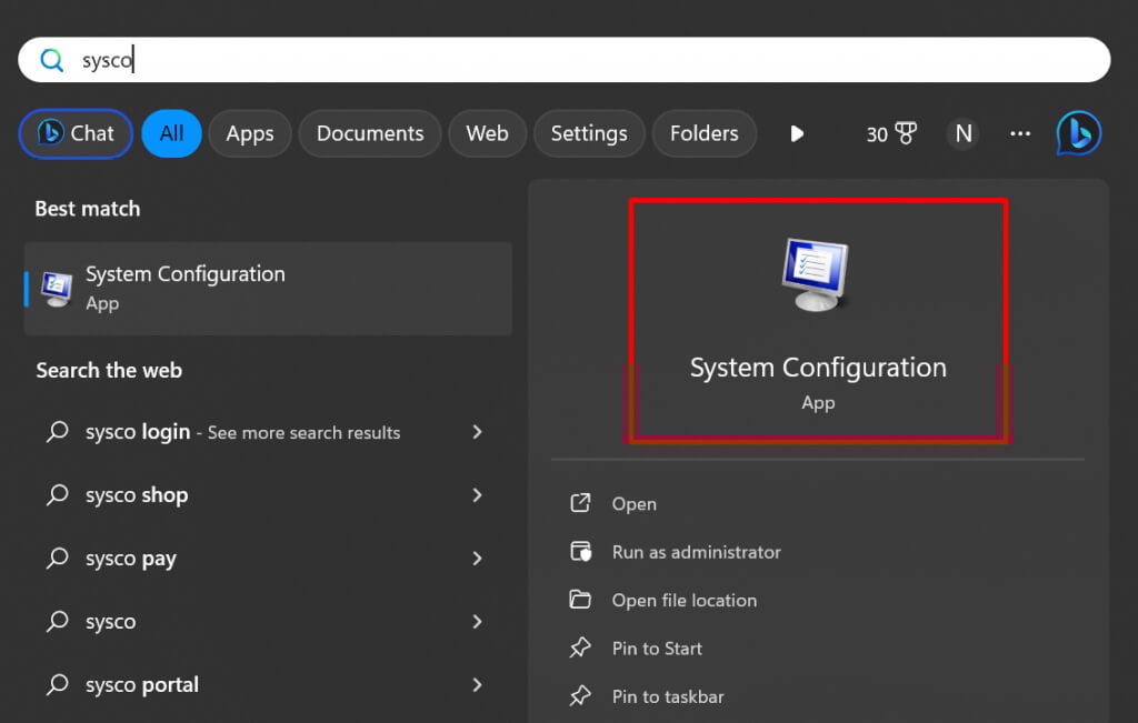- Open the Start menu search bar and type sysconfig. Click the System Configuration option.