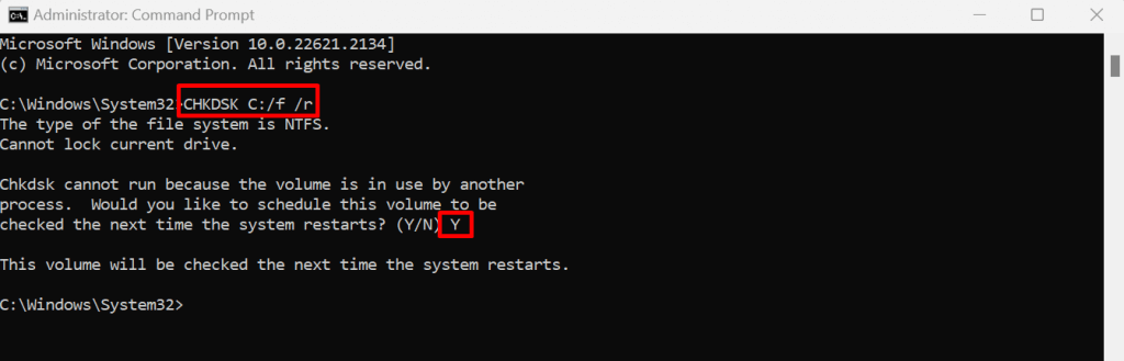 It could be that issues with the hard drive are causing Notepad to close automatically. If you suspect this is the case, run the CHDSK command to find and fix these bad sectors. Here’s how: