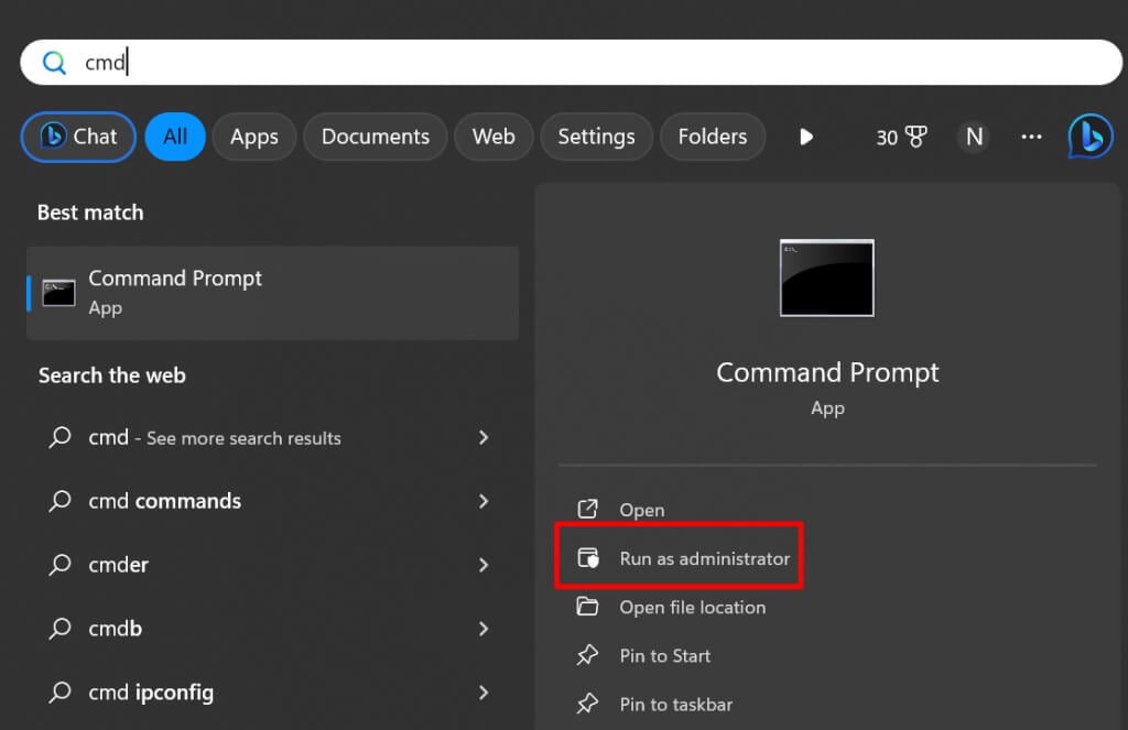 - Type cmd in the Windows search bar to find Command Prompt. On the left panel, select Run as Administrator.