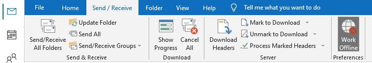 - Select the Send/Receive menu from the top. The final option in this menu is Work Offline. It works as a toggle, so clicking on it will disable the setting if it was activated.