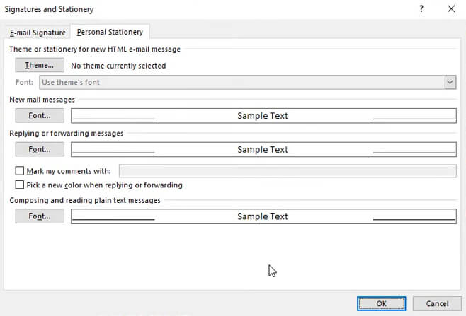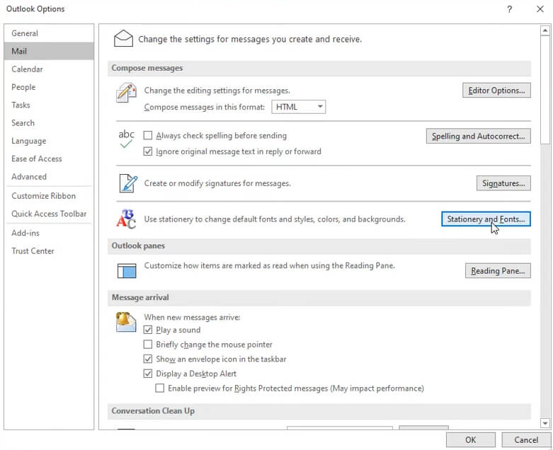 - This shows you a bunch of settings related to the formatting of your email content. Click on the Stationery and Fonts button.