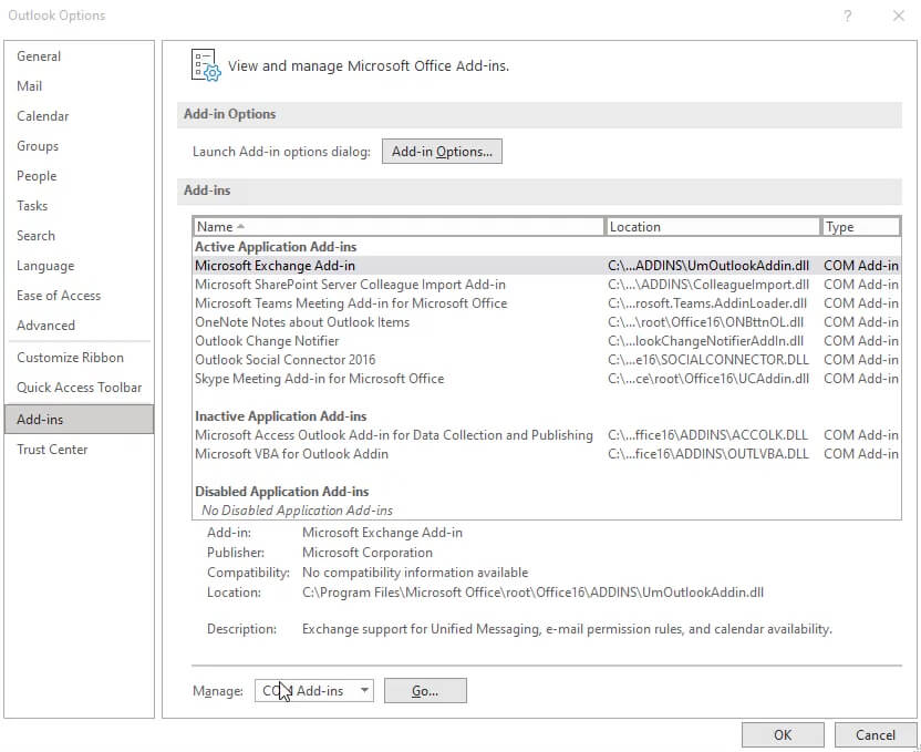 - This tab lists all the add-ins installed on your computer. Make sure that the Manage field reads COM Add-ins and hit the Go button.